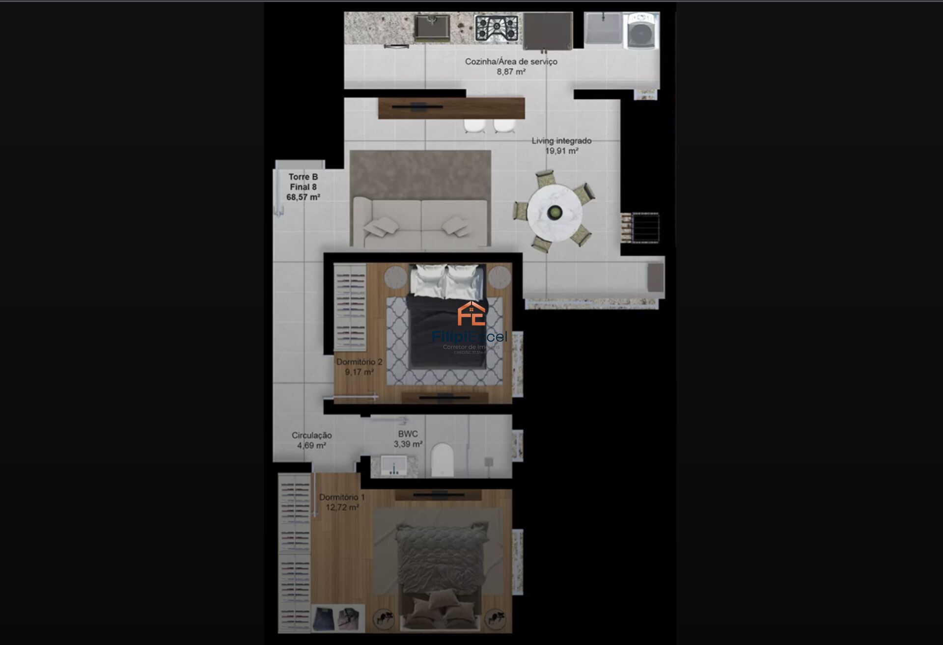 Apartamento de alto padrão no Donatello, Torre B (em construção), planta final 08, com 02 dormitórios, 01 banheiro, 01 vaga de garagem e área privativa de 68,57m2.